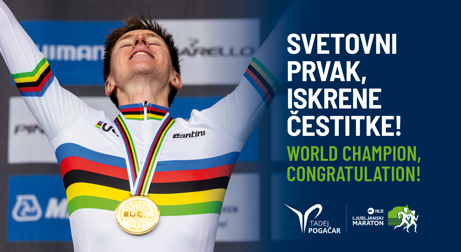 Organizatorji NLB Ljubljanskega maratona čestitamo našemu podporniku Tadeju Pogačarju za veličastno zmago na svetovnem kolesarskem prvenstvu v Zurichu. Bravo Tadej!