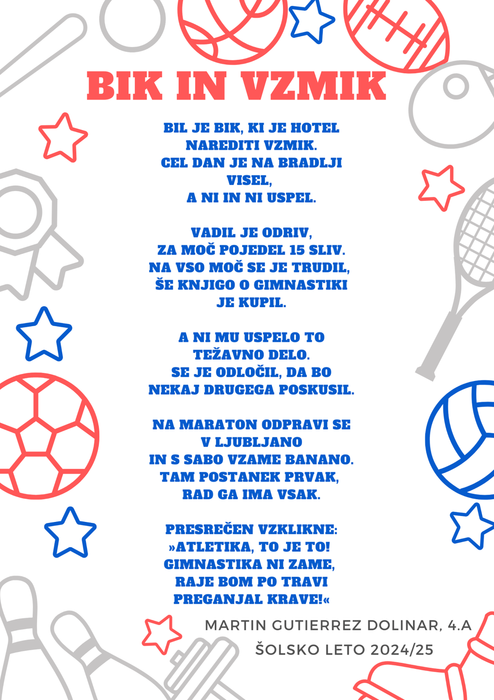 Za ustvarjalno idejo so učenci izhajali iz pesmi z naslovom Bik in vzmik, ki jo je napisal Martin Guttierez Dolinar (5. a). Skupaj s sošolcema Maksom Krnecem in Zarjo Hvalc je pesem prenesel v obliko izvirne table, ki je s svojo domiselnostjo in pozitivnim sporočilom navdušila tako obiskovalce kot žirijo. Oba dečka sta na maratonu tudi tekla, s čimer sta združila ustvarjalnost in športni duh – pravo srce Ljubljanskega maratona.