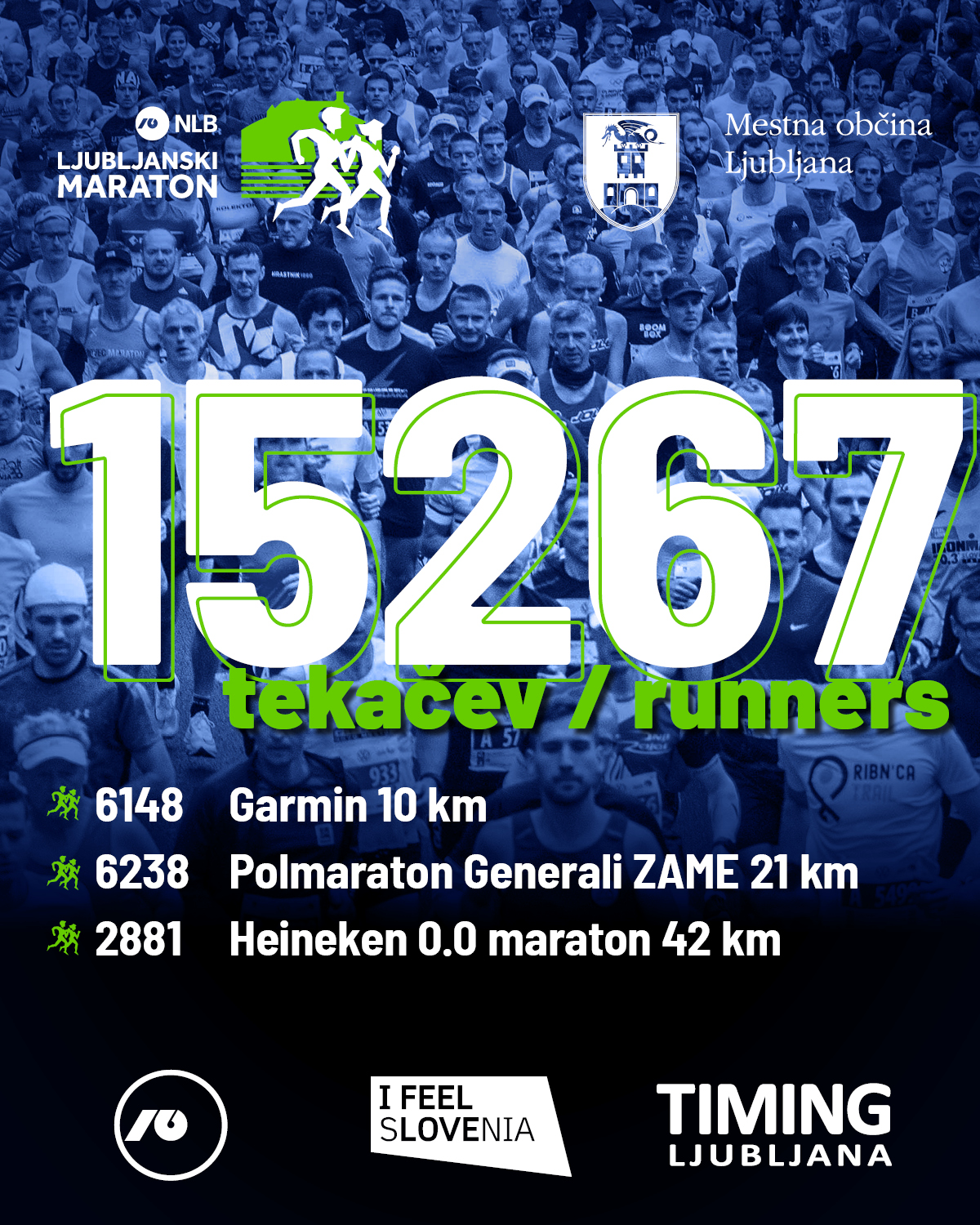 V nedeljo, 20. oktobra vas bo po ljubljanskih ulicah teklo 15.267 tekačev. Na Garmin 10 km vas je prijavljenih 6.148, na polmaraton Generali ZAME 6.238, na Heineken 0.0 maraton pa z velikim naskokom 2.881 tekač. Izjemno ponosni smo, da je Slovencev kar 10.175. Rekord vseh časov smo postavili s 5.092 tujimi tekači iz 86 držav. Veseli dejstvo, da smo prav na vseh razdaljah povečali število tekačev.