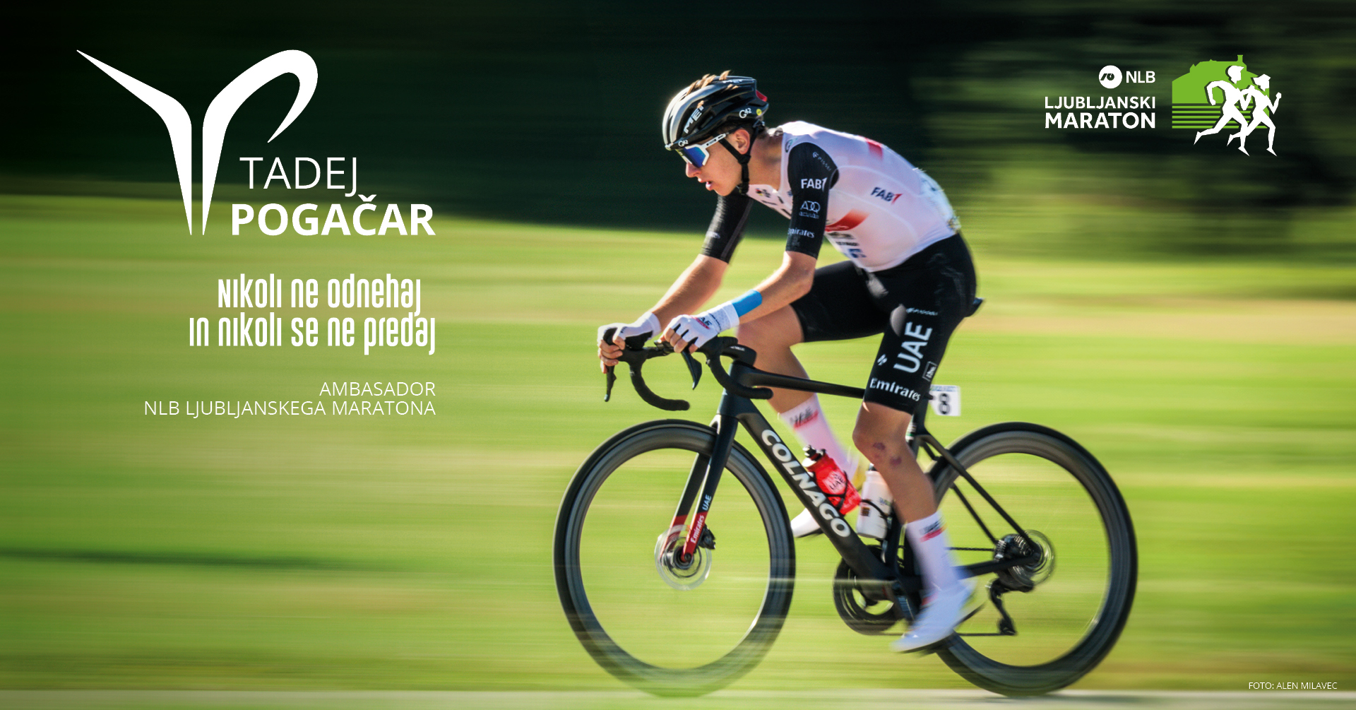 Vrhunski slovenski kolesar Tadej Pogačar, dvakratni zmagovalec Tour de France, in nosilec rumene majce na aktualni francoski pentlji, je pripravil prav posebno video vabilo za vse, ki se boste ali pa še razmišljate o tem, da bi se udeležili NLB Ljubljanskega maratona. Tadej še kako dobro ve, da se je za najslajše zmage potrebno posebej potruditi. A vsaka pot do zmage se začne z odločitvijo za udeležbo na dirki. Če torej želite uživati v norem tekaškem vzdušju na NLB Ljubljanskem maratonu in lepih vedutah naše prestolnice, ne odlašajte s prijavo. Če pa ste že med tistimi, ki neučakano čakate konec oktobra, naj to vabilo poskrbi za dodaten polet na treningih. Med tem pa, seveda, stiskajmo pesti, da se Tadej tudi v Nico pripelje v rumenem.