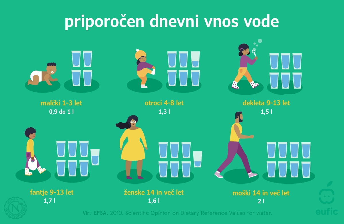 Voda, voda in še enkrat voda. Tista za odžejati, tista za plavanje (ali kopanje), v tem času nam prav pride celo ona, ki nas ob poletnih popoldnevih preseneti brez dežnika. Pitna telesu pomaga pri uravnavanju telesne temperature, preko krvi oskrbuje celice s hranili in kisikom, odplavlja odpadne snovi, nahaja se v prebavnih, sklepnih in drugih telesnih tekočinah, varuje organe in vezivna tkiva. Telo izgublja vodo preko kože z znojenjem, preko ledvic z urinom, preko pljuč z izdihanim zrakom in preko črevesja z iztrebki. Pri normalni aktivnosti lahko izgubimo z znojenjem do enega litra vode dnevno, medtem ko pri enourni intenzivni vadbi ali pri visoki zunanji temperaturi izgubimo več kot liter vode na uro. Izgubljeno vodo je treba stalno nadomeščati, predvsem s popitimi tekočinami. Nekaj vode zaužijemo s hrano, nekaj se je tvori pri presnovi hranil v telesu. Za preživetje naj bi odraslim zadoščalo povprečno dva do tri litre vode na dan.
